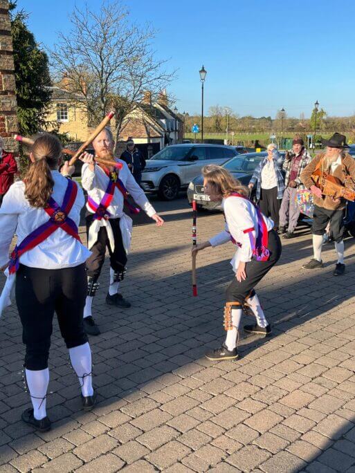Practise Cotswold from October to May on Monday evenings from 7.45 followed by a drink at the local pub to chat and catch up with the news. Current traditions include Adderbury, Badby, Bampton, Fieldtown, Raglan, Juniper Hill and our own Fenstanton dances. We dance out, mainly in the summer, starting at dawn on May Day.