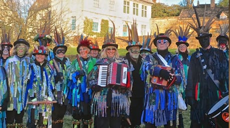 Happenstance is a mixed Border Morris side dancing to live music. We were formed in 2011 and are based in Winchcombe, Gloucestershire, nestling in the shadow of Cleeve Hill. We aim to be a community group and often perform in and around the town of Winchcombe, but we have also danced in folk festivals and other events. On Thursdays during the summer, we dance out at selected local hostelries, often dancing out with other local sides. We dance a mixture of traditional border dances as collected and newly-coined dances, some written by members of the group. Our lively music features accordeon, melodeon, banjo, shawm, percussion and sometimes soprano saxophone or whistle. Our costume is tatter coats, bowler hats with pheasant feathers and face paint (but not full black). Happenstance welcomes both men and women of all ages as dancers and musicians. We meet to practice at Abbeyfields Community Centre every Thursday night in the winter months (September–April) between 7.30 to 9.00 p.m. then sometimes repair to a local hostelry.