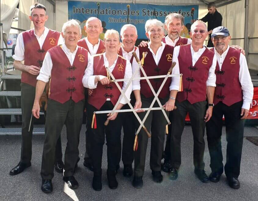 Sullivan’s Sword emerged from a mummers’ group in the mid seventies. Today we are an active mixed longsword side performing both locally, nationally and every two years at a street festival in Sindelfingen, Germany. In January we host our annual Plough Sunday event in Southwell, Nottinghamshire where we also perform the Farnsfield Plough Play. Dressed in bright array – claret and yellow waistcoats and green moleskin trousers – we are proud to perform six dances: Ampleforth, Escrick,  Haxby, Helmsley, Salton and Sleights. We practice on Tuesday’s and we are actively looking for new members to learn the intricacies of these fine dances.